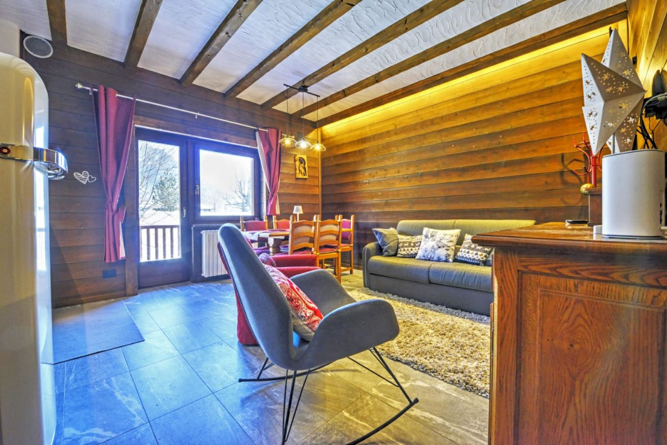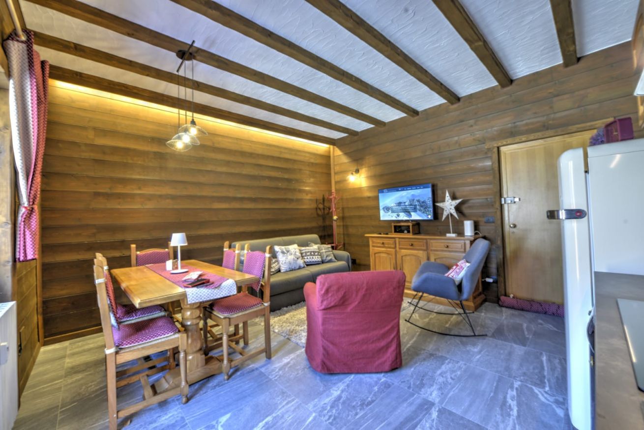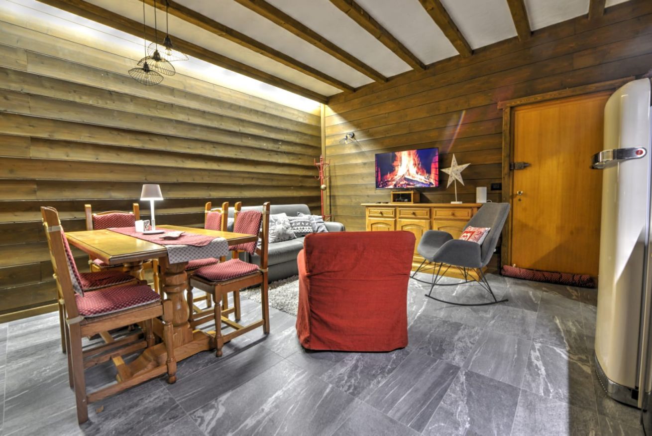 Appena entrati da Anima Alpina, sarete accolti da un ampio living open-space, il cuore pulsante della casa: una cucina attrezzata e un salotto intimo, perfetto per rilassarsi dopo una giornata sulla neve. La vera perla? Il balcone affacciato direttamente sul giardino innevato: il luogo ideale per respirare l'aria frizzante di montagna baciati dal sole.