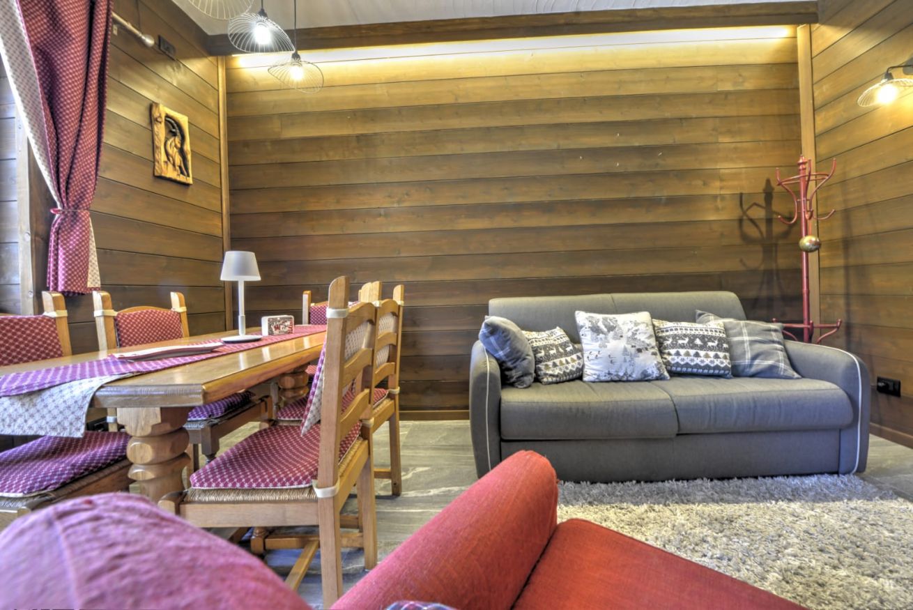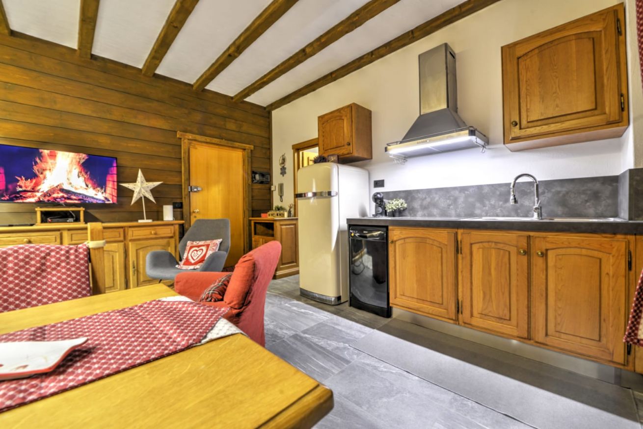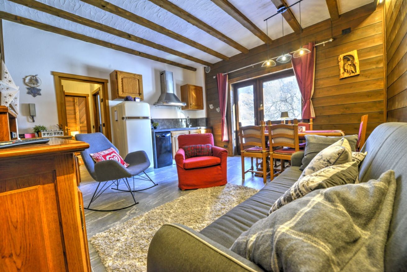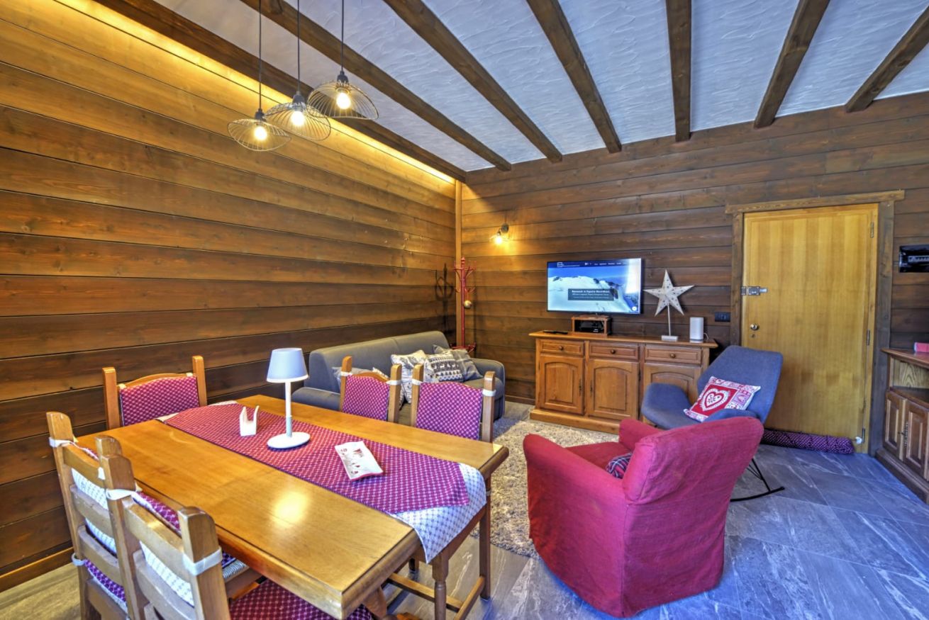 Appena entrati da Anima Alpina, sarete accolti da un ampio living open-space, il cuore pulsante della casa: una cucina attrezzata e un salotto intimo, perfetto per rilassarsi dopo una giornata sulla neve. La vera perla? Il balcone affacciato direttamente sul giardino innevato: il luogo ideale per respirare l'aria frizzante di montagna baciati dal sole.