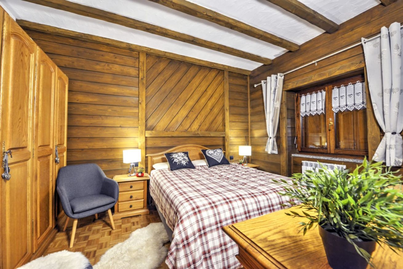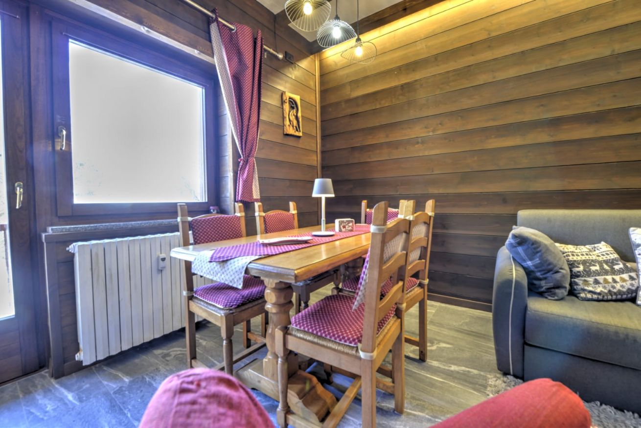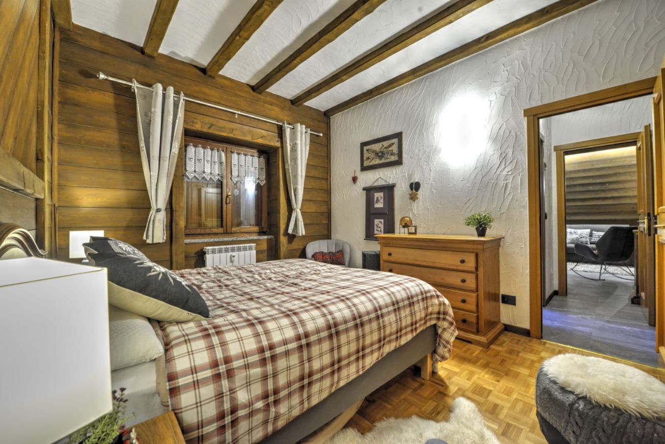 La zona notte offre una camera da letto accogliente, mentre la funzionalità è garantita da un bagno moderno e da un disimpegno intelligentemente attrezzato con portasci, scaldascarponi e una pratica cabina armadio.
