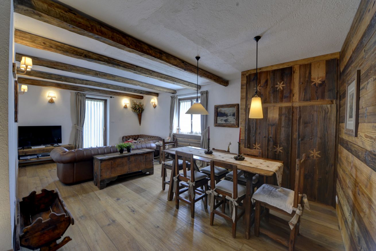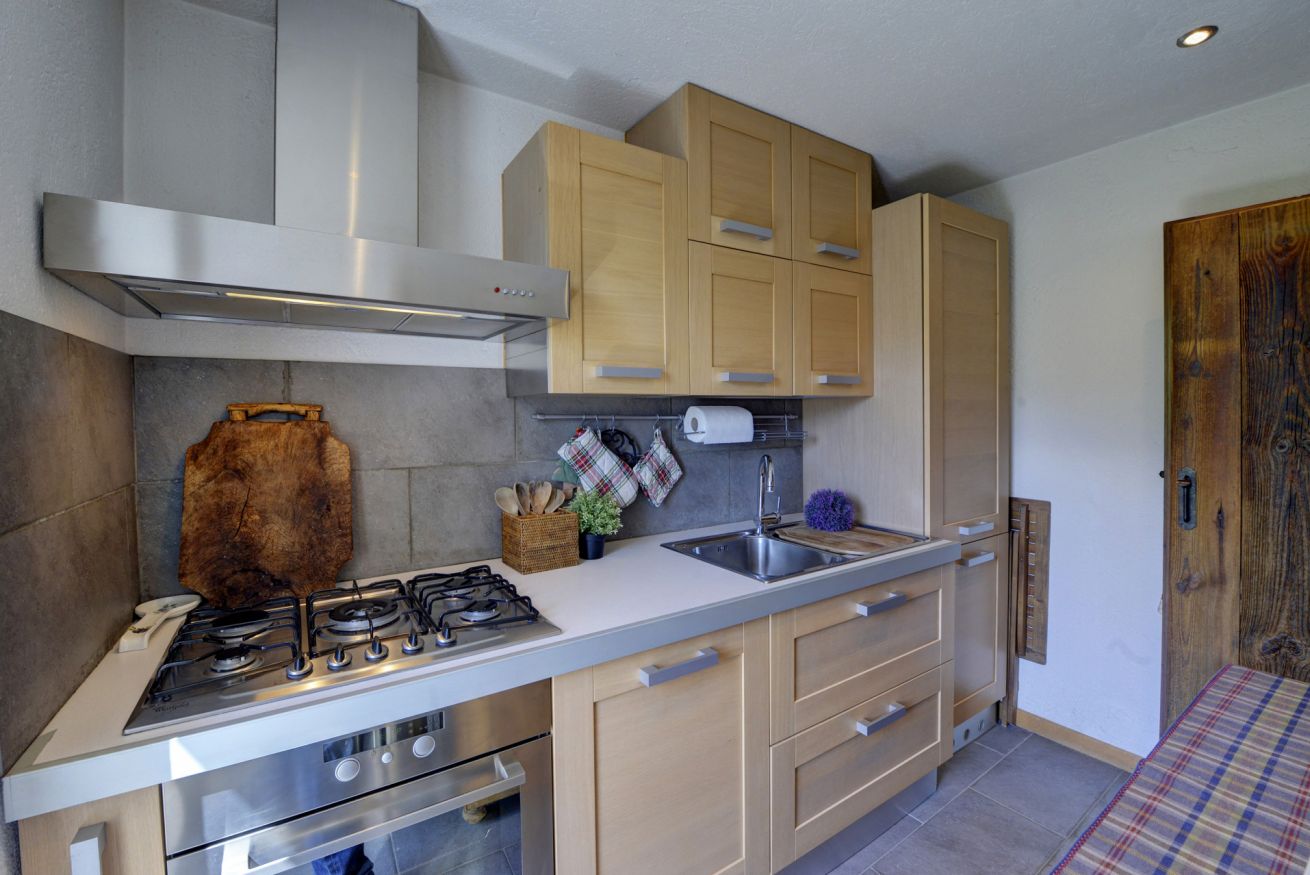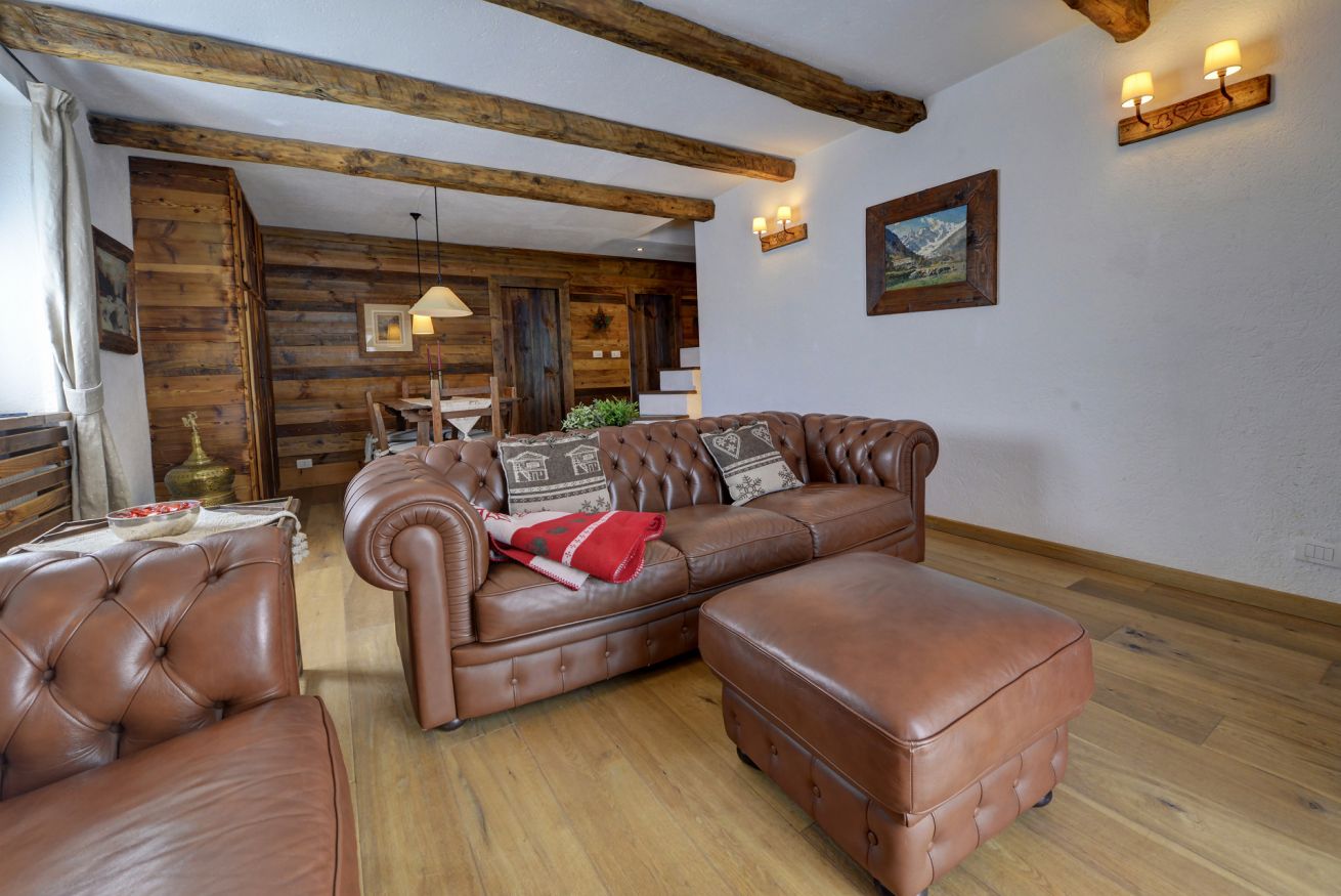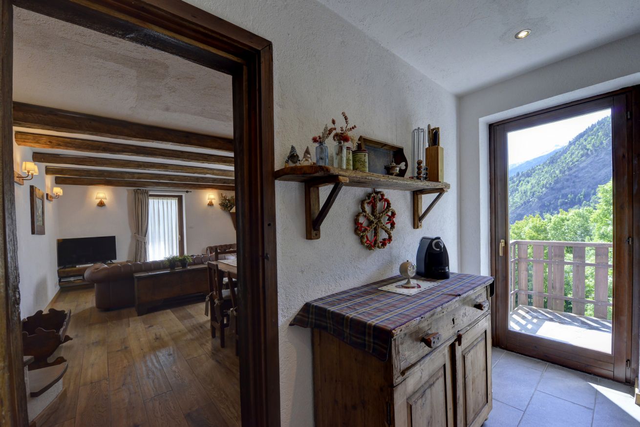 La cucina attrezzatissima, cuore pulsante della casa, non è da meno. Da qui, un'altra porta finestra si apre su un ampio balcone orientato a nord-ovest, offrendo una vista mozzafiato sul fiero Monte Crammont e su un tratto suggestivo della leggendaria catena del Monte Bianco. Immagina di sorseggiare il tuo caffè del mattino o di goderti un aperitivo serale con questo scenario alpino a fare da cornice.