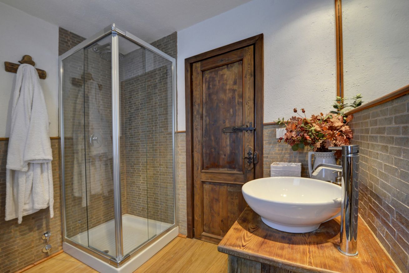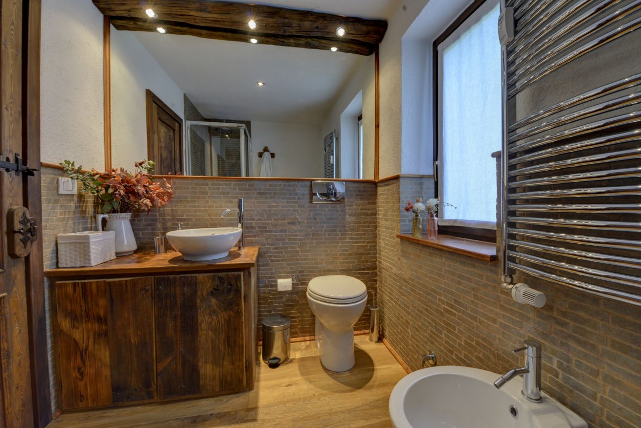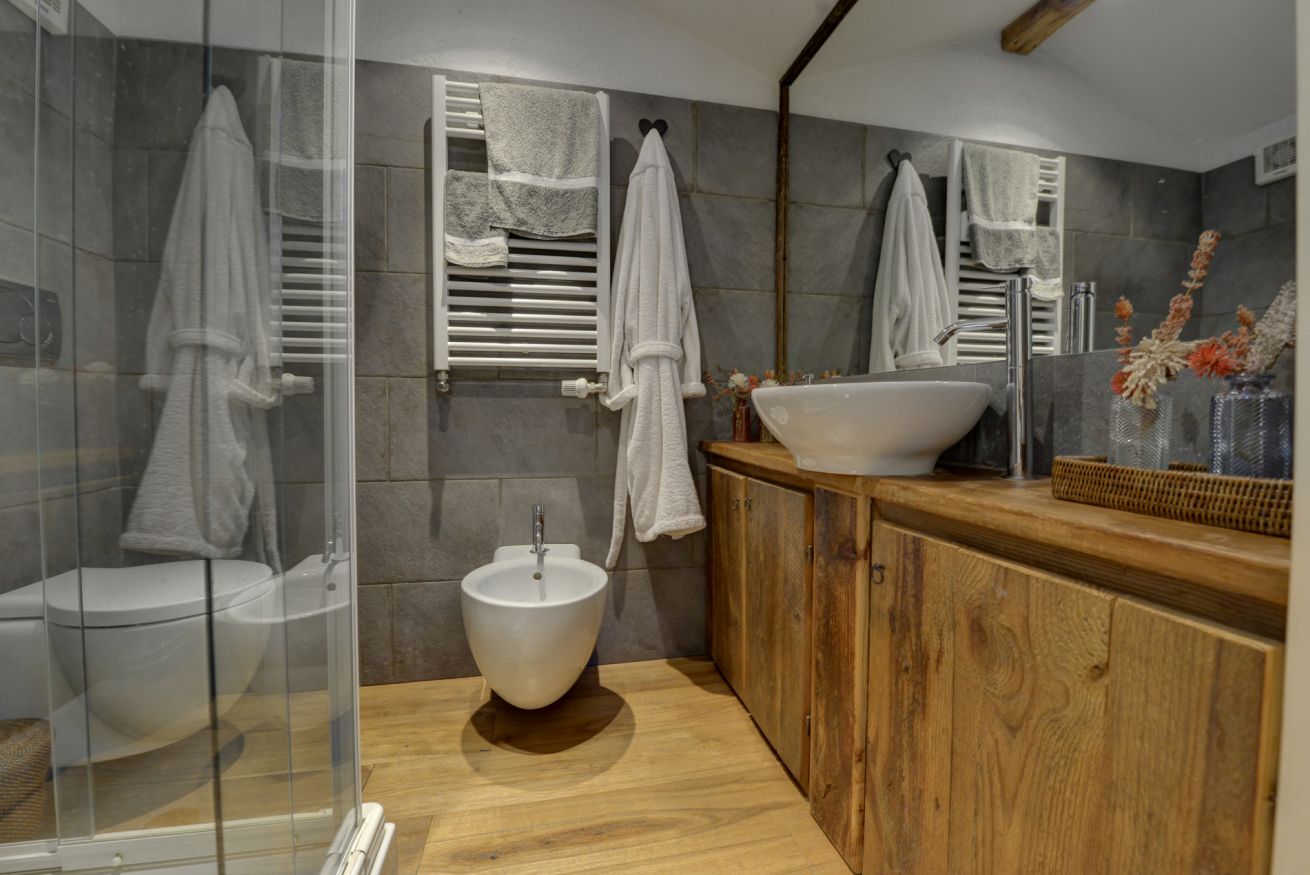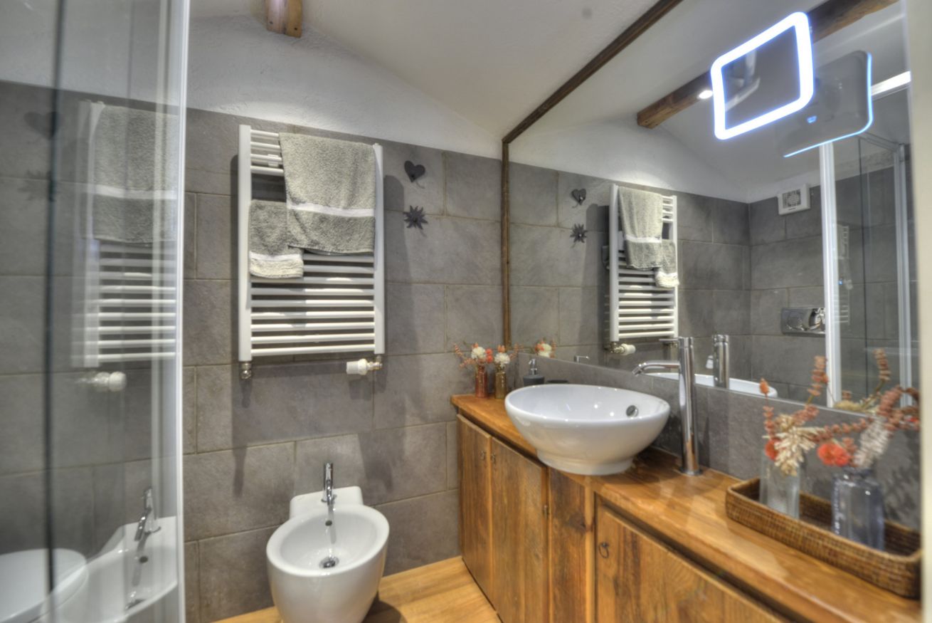 Un magnifico ed elegante bagno completa con stile e funzionalità il piano inferiore, anticipando la raffinatezza che ti attende al piano superiore.